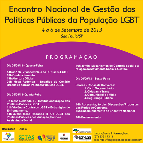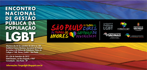 A Prefeitura Municipal de Vitória da Conquista, por meio da Assessoria de Políticas para Diversidade Sexual da Secretaria de Desenvolvimento Social, participa entre os dias 4 e 6 de setembro do I Encontro Nacional de Gestores e Gestoras LGBT.O evento a ser realizado na cidade de São Paulo é promovido pelo governo paulista e pelo Fórum Nacional de Gestoras e Gestores Estaduais e Municipais de Políticas para a população de Lésbicas, Gays, Bissexuais, Travestis e Transexuais (Fonges LGBT) .