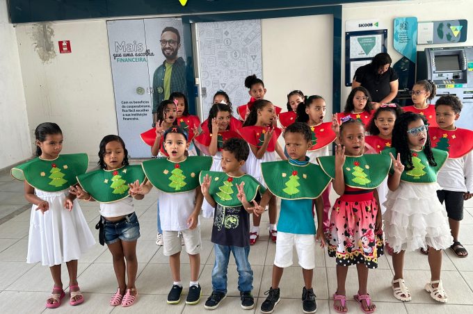 Com apoio do Sicoob Credcoop, coral de alunos da Creche Criança Esperança se apresenta no pátio da Prefeitura