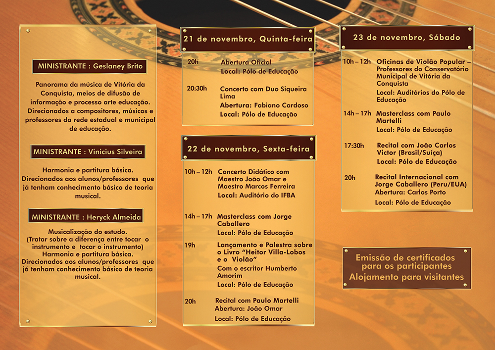 Começa nessa quinta-feira, 21 o I Festival Internacional de Violão de Vitória da Conquista, promovido pela Prefeitura, por meio das secretarias municipais de Educação e de Cultura, em parceria com o Movimento Violão. O evento, que integra as comemorações do aniversário de 173 anos de Vitória da Conquista, acontecerá entre os dias 21 e 23 de novembro.