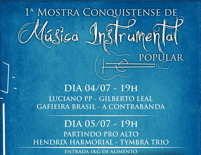 Será realizada, nos dias 4 e 5 de julho, a I Mostra Conquistense de Música Instrumental Popular. O evento, que será realizado no Centro de Cultura Camillo de Jesus Lima, visa promover um intercâmbio cultural e de conhecimento, com discussões sobre “Políticas Públicas de Música Instrumental Popular em Vitória da Conquista”, “A Música Instrumental que Queremos” e “Música Instrumental Brasileira Contemporânea”.