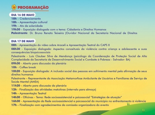 Além do seminário, será realizado pela Secretaria Municipal de Saúde, por meio da Coordenação de Saúde Mental, Álcool e outras Drogas, Desenvolvimento Social, em parceria com a Associação Usuários e Familiares da Saúde Mental de Vitória da Conquista, Fainor, Juvêncio Terra e FTC, Uesb e Ufba, no sábado, 18 de maio, na Praça 9 de Novembro, às 9 horas, um ato público.