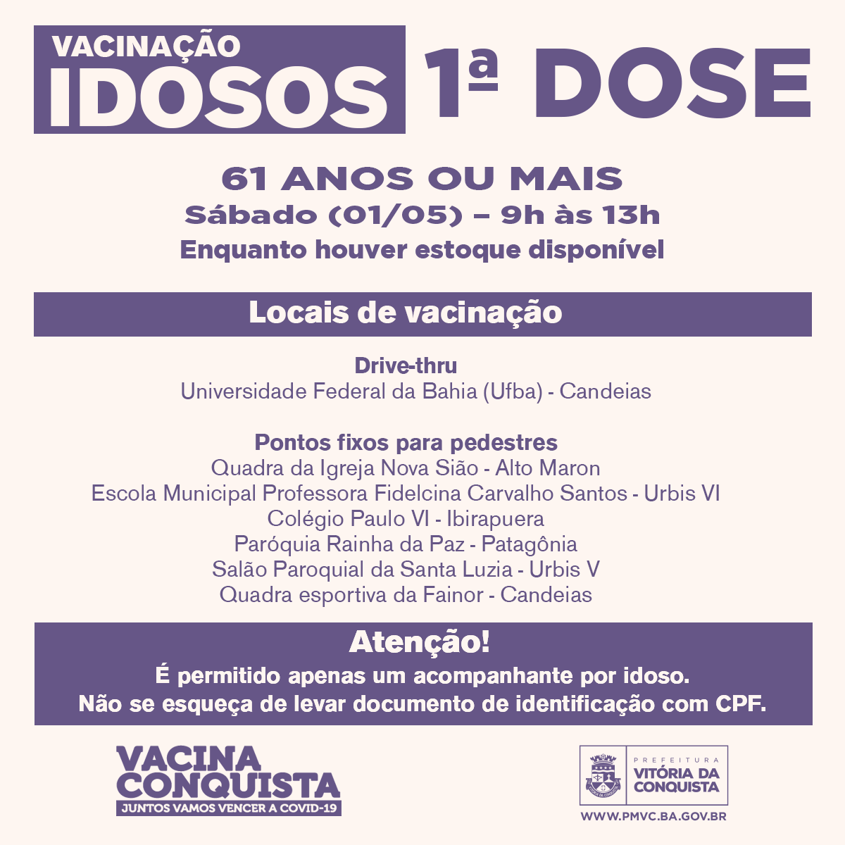 A Secretaria Municipal de Saúde (SMS) dará início, neste sábado (1º), à vacinação da 1ª dose da vacina Oxford/Fiocruz para os idosos na faixa etária de 61 anos ou mais. A vacinação acontece das 9h às 13 horas, ou enquanto houver doses disponíveis.
