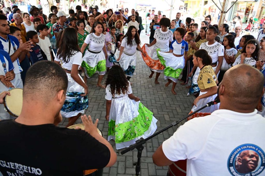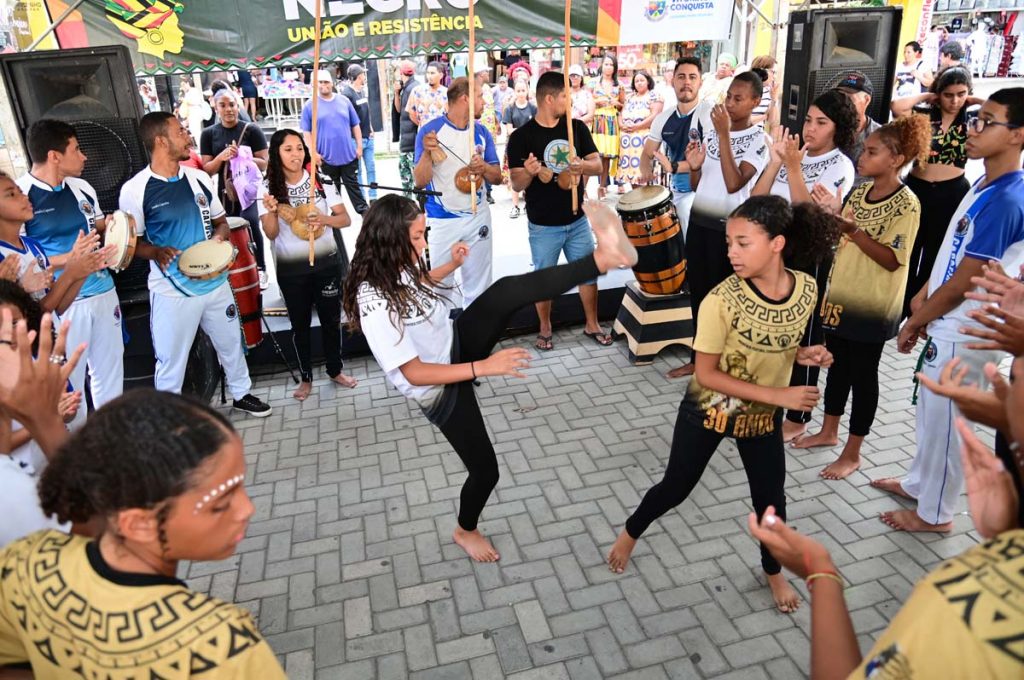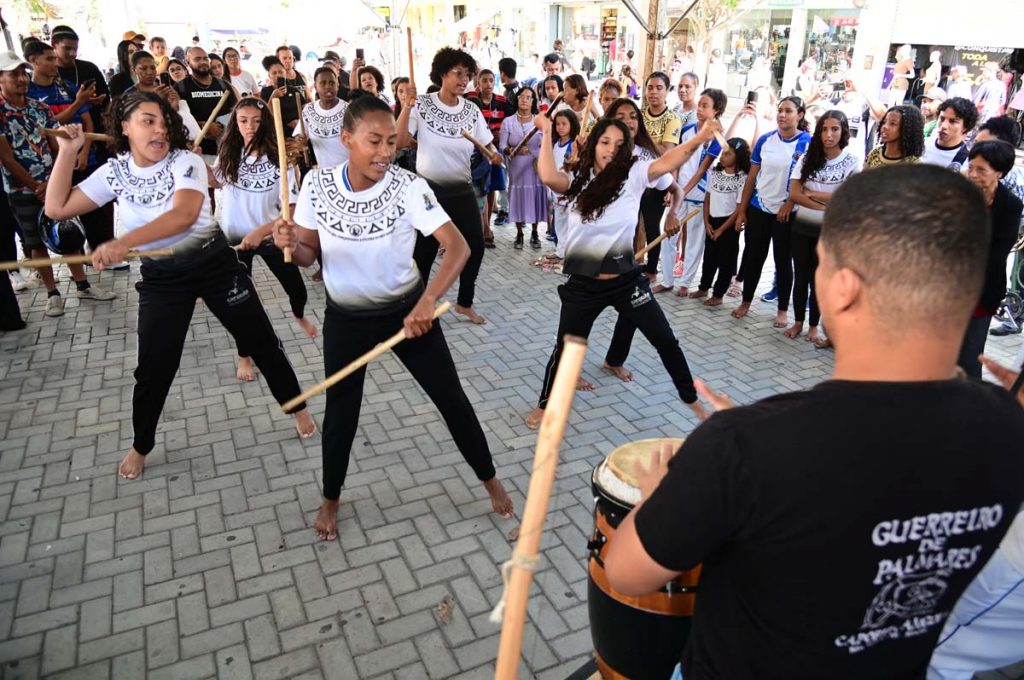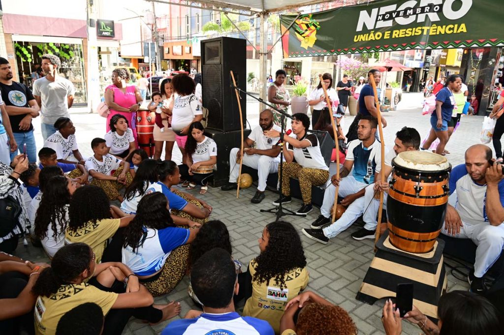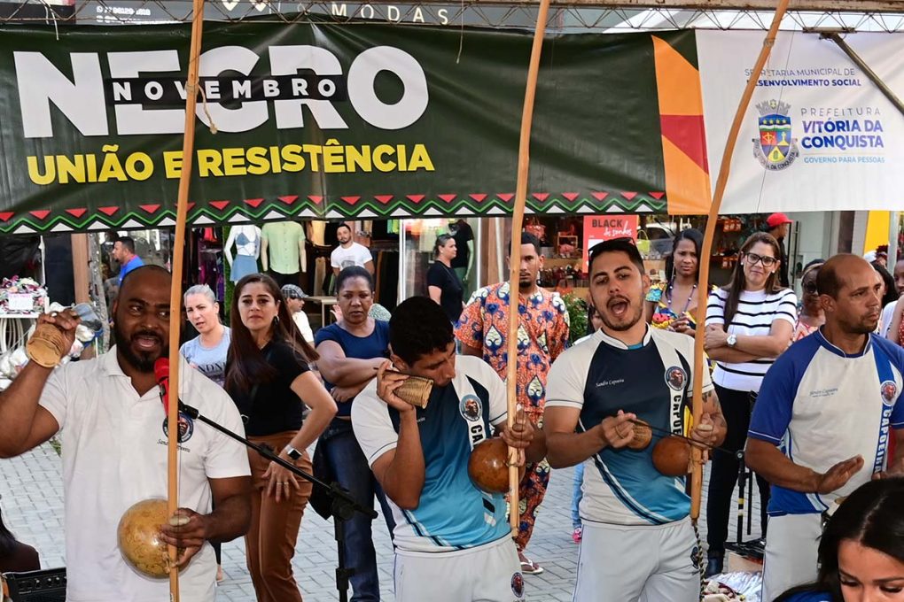 O Novembro Negro é o ponto alto das políticas públicas de Igualdade Racial promovidas em Vitória da Conquista durante todo o ano. Por isso, nesta terça-feira (19), um dia antes do Dia de Zumbi e da Consciência Negra, a Prefeitura de Vitória da Conquista realizou a palestra União e Resistência: A importância das Políticas de Igualdade Racial no Serviço Público, direcionada aos servidores municipais, pela manhã. Já no período da tarde, o movimento aconteceu na Praça Nove de Novembro ao som dos tambores, atabaques e berimbau com as apresentações de capoeira, maculelê e samba de roda, além da fala do povo de axé, representado pela Rede Caminho dos Búzios.