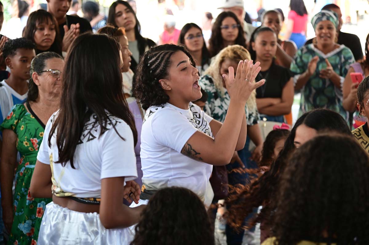 Os responsáveis pela roda de capoeira, maculelê e samba de roda foram os integrantes da Associação Cultural e Artística Memória de Bimba, que teve à frente o mestre Sandro. “A gente está aqui para militar enquanto movimento de resistência negra pela cultura do povo preto e pela consciência humana”, disse. Representando a Rede Caminhos dos Búzios, a sacerdotisa Luanda de Oxum completou: “O pouco que nós somos, o pouco que nós fazemos aqui, quer dizer muito. É de suma importância e alegria para nós estarmos aqui também nesse momento de culminância dessa semana que a gente traz em relação à cultura negra”.