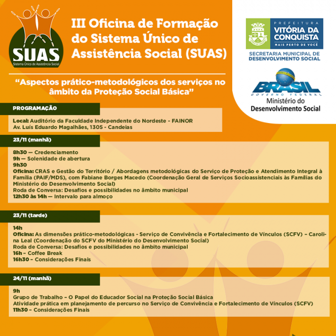 Nesta terceira edição, a Oficina de Formação Continuada abordará os “Aspectos prático-metodológicos dos serviços no âmbito da Proteção Social Básica”, e contará com a participação das técnicas Fabiane Borges Macedo (coordenadora substituta da Coordenação Geral de Serviços Socioassistenciais às Famílias/MDS) e Carolina Leal (coordenadora substituta da Coordenação do Serviço de Convivência e Fortalecimento de Vínculos/MDS).