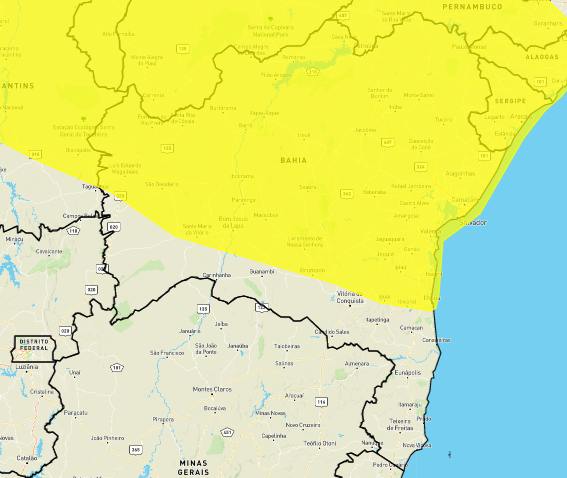 Vitória da Conquista está em alerta amarelo, de chuvas intensas, emitido pelo Instituto Nacional de Meteorologia (Inmet). A sinalização indica perigo potencial de chuvas de até 50 milímetros por dia, além de ventos intensos, que podem chegar a 60 km/h. Há baixo risco de corte de energia elétrica, queda de galhos de árvores, alagamentos e descargas elétricas.