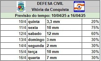 O Instituto Nacional de Meteorologia (Inmet) emitiu, nesta quinta-feira (10), aviso de chuvas intensas para Vitória da Conquista, com grau de severidade “perigo potencial” válido até esta sexta-feira (11), às 10h. A previsão é de chuva entre 20 e 30 mm/h ou até 50 mm/dia, ventos intensos (40-60 km/h), com baixo risco de corte de energia elétrica, queda de galhos de árvores, de alagamentos e descargas elétricas.