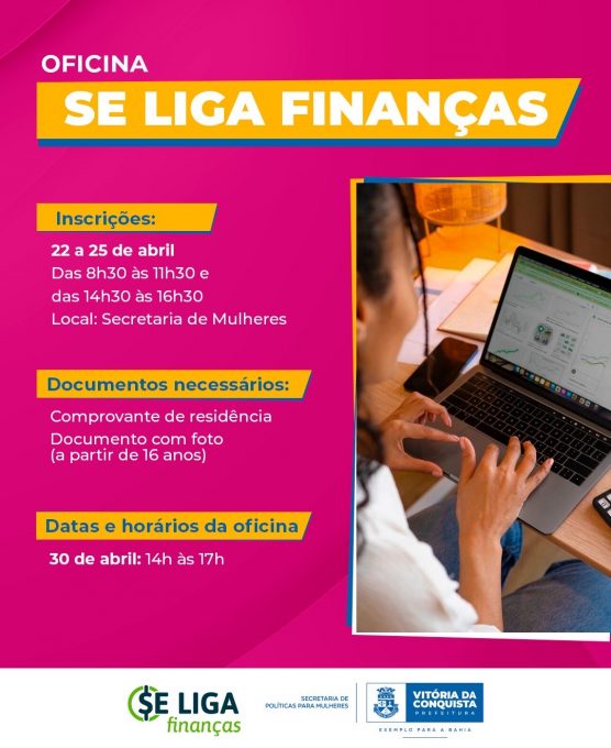 A Secretaria Municipal de Políticas para Mulheres (SMPM), em parceria com o Sicoob Credcoop, está com inscrições abertas para a oficina Se Liga Finanças, a partir de terça-feira (22) até 25 de abril. As inscrições acontecem presencialmente, das 8h30 às 11h30 e das 14h30 às 16h30, na sede da SMPM, localizada na Avenida São Geraldo, nº 650, bairro Recreio. Para se inscrever, são necessários documento com foto e comprovante de residência, original e cópia.