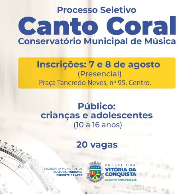 Além da disponibilidade para participar do canto coral no horário matutino, os interessados devem cumprir outros requisitos, entre eles, serem alfabetizados, residirem em Vitória da Conquista e não possuírem conhecimento musical.