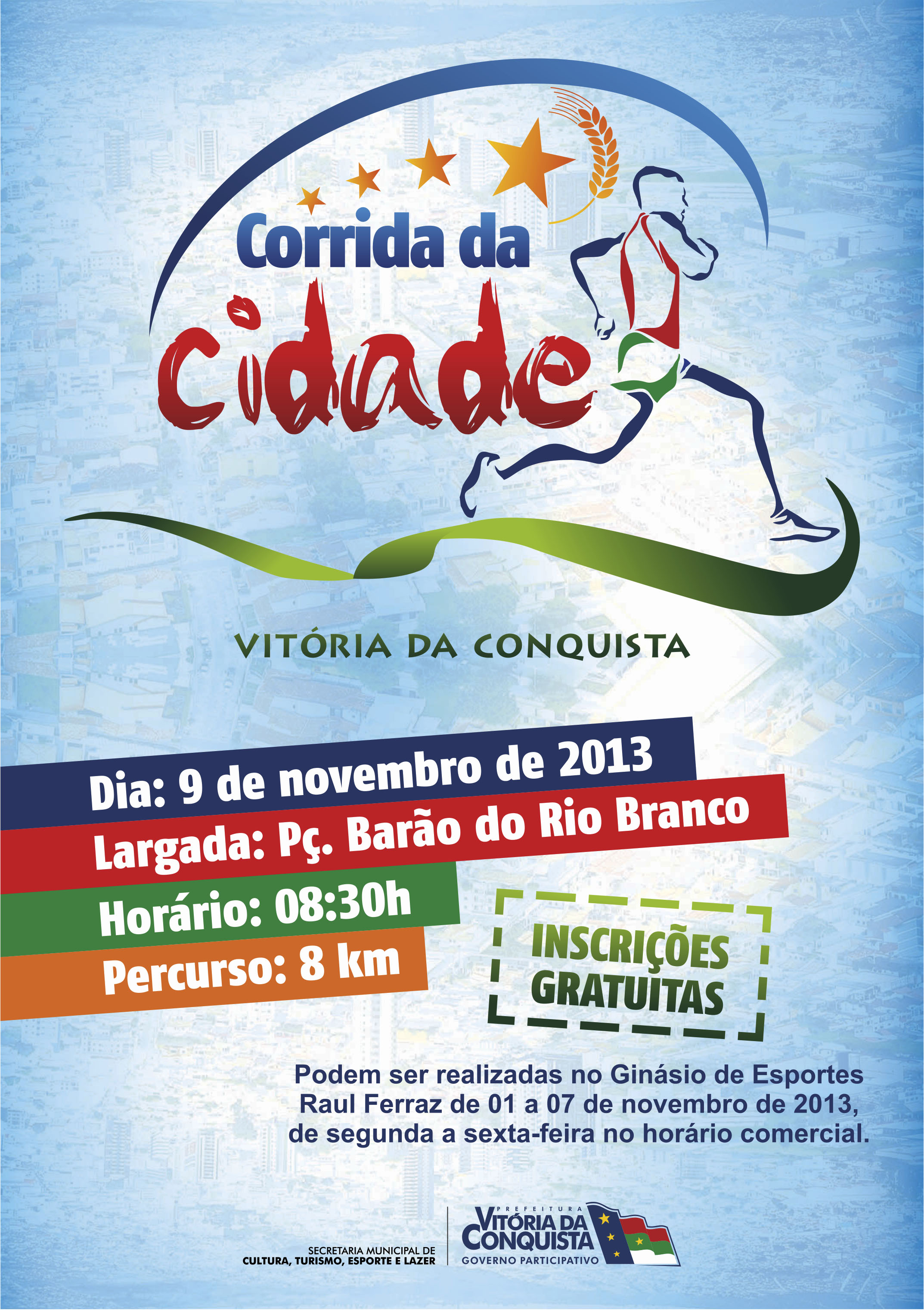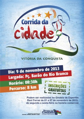Como parte da programação do aniversário de Vitória da Conquista será realizada a tradicional Corrida da Cidade – uma competição esportiva que integra atletas amadores e profissionais. Para participar, é necessário se inscrever, de forma gratuita, no Ginásio de Esportes Raul Ferraz, no período de 1º a 7 de novembro, das 8h às 12h e das 14h às 18h.