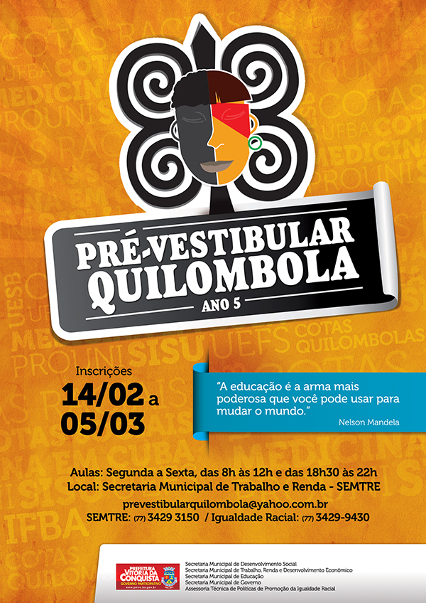Saiba mais –O Pré-Vestibular Quilombola é uma das ações que integra a Política de Promoção da Igualdade Racial, desenvolvida pela Prefeitura de Vitória da Conquista. Desde 2009, o cursinho já conseguiu promover a aprovação de mais de 130 quilombolas – alunos, ex-alunos e pré-vestibulandos mobilizados – em instituições como Uesb, Uefs e Ufba.