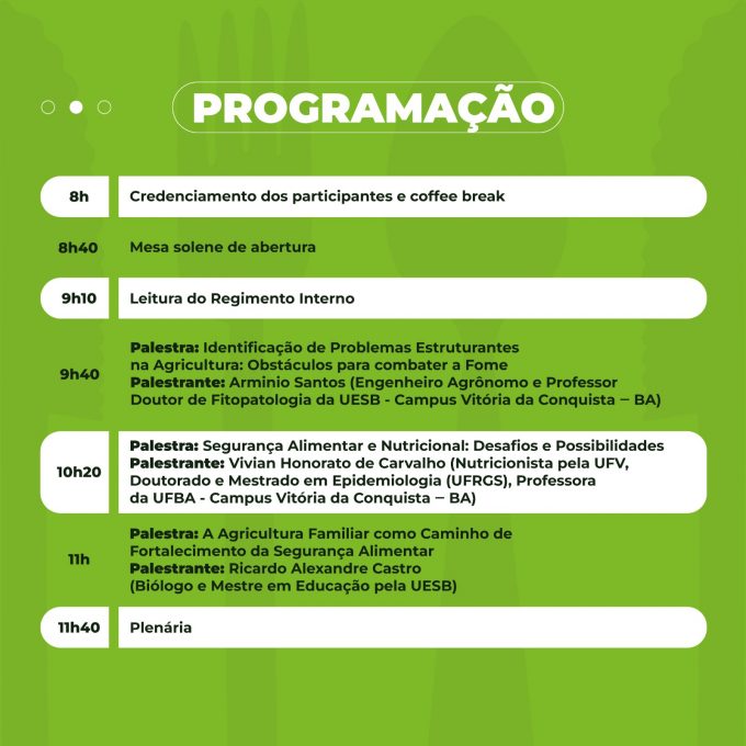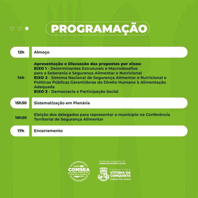 Para o secretário de Desenvolvimento Social, Michael Farias, esse momento conferencial terá uma importância estratégica nesse período de pós pandemia, considerando os desafios que estão postos para se enfrentar a fome no país. “Aqui em Vitória da Conquista temos avançado nesse debate”, reforçou.