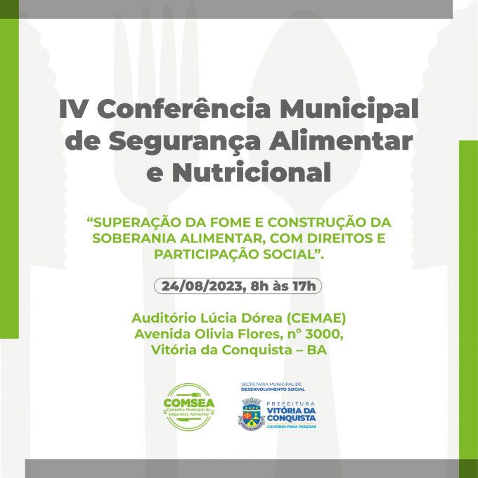 A Prefeitura e o Conselho Municipal de Segurança Alimentar e Nutricional (COMSEA) realizam na próxima quinta-feira, 24, a IV Conferência Municipal de Segurança Alimentar e Nutricional, com o tema: “Superação da fome e construção da soberania alimentar, com direitos e participação social”, que tem por objetivo fortalecer a política municipal de segurança alimentar e nutricional e identificar problemas estruturantes que impedem a superação da fome e da insegurança alimentar.