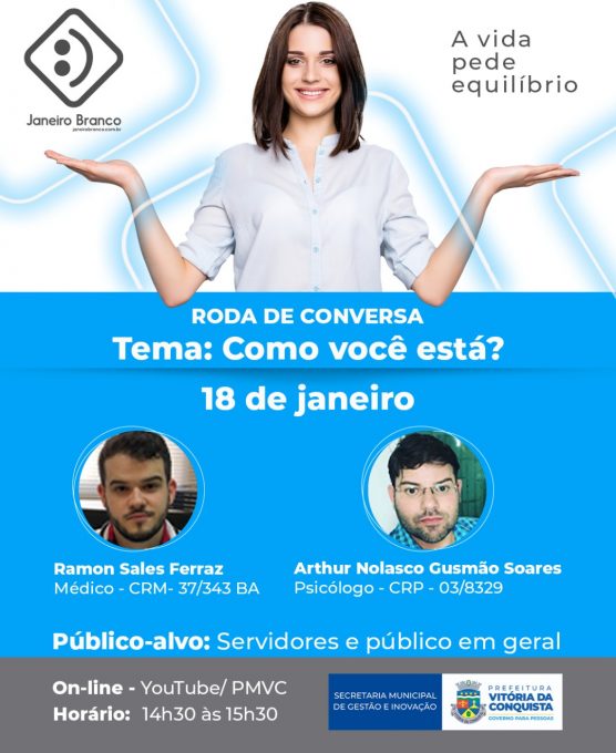 Um evento on-line que será transmitido pelo canal do Youtube da Prefeitura de Vitória da Conquista, entre 14h30 e 15h30 do dia 18 de janeiro, marca a adesão da Secretaria Municipal de Gestão e Inovação (Semgi) à campanha nacional “Janeiro Branco: A vida pede equilíbrio”.