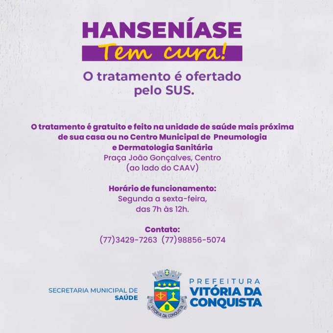 Em Vitória da Conquista, segundo dados do Sistema Nacional de Notificação (Sinan), nos últimos 10 anos, foram identificados 458 pacientes com diagnóstico de hanseníase, desses 42,9% apresentaram algum grau de incapacidade física devido ao diagnóstico tardio. Em 2024, 19 pessoas foram diagnosticadas com a doença. Por isso, a SMS considera a campanha do Janeiro Roxo como fundamental para discutir a doença como problema de saúde pública, orientando a população sobre o acesso e o tratamento da hanseníase.