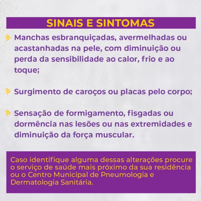 A Secretaria Municipal de Saúde (SMS), por meio da Diretoria de Vigilância à Saúde, está realizando a campanha Janeiro Roxo de prevenção à hanseníase. O tema “Hanseníase: identificou tratou, curou” traz um alerta à população sobre a existência da doença, os principais sinais e sintomas, qual serviço deverá procurar e como é feito o tratamento.