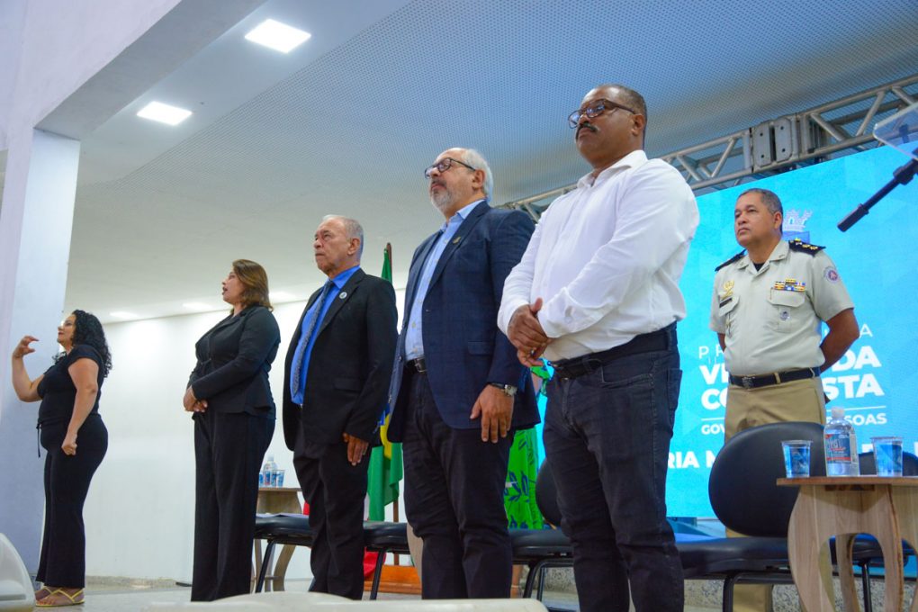 O evento nesta manhã foi aberto com apresentações musicais e uma oração feita pelo Pr. Davi Boa Sorte, que cedeu o espaço para realização do evento. Ainda se fizeram presentes o subcomandante de Policiamento da Região Sudoeste (CPR Sudoeste), tenente-coronel Leite, secretários municipais e o presidente do Conselho Municipal da Educação, Marco Vinícius Lopes.