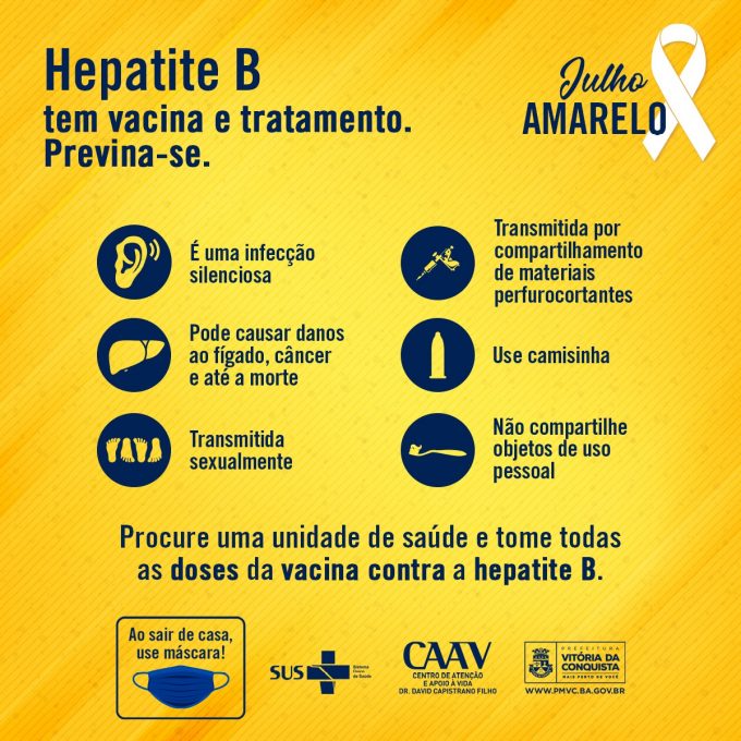 Em Conquista, o Centro de Atenção e Apoio à Vida Dr. David Caspistrano Filho (CAAV) é o serviço de referência para o atendimento de pacientes diagnosticados com hepatites virais. Durante este mês, serão feitas ações para conscientizar e informar a população, mas de uma forma diferente, considerando o atual momento de pandemia da Covid-19, como explica Riviane Santana, coordenadora do CAAV: “Não teremos como partir para ações coletivas, como já fizemos nos anos anteriores em escolas, empresas e serviços de saúde. Mas a ação está voltada aos pacientes que buscarem o CAAV para realizar a testagem gratuita para diagnóstico, que será ofertada durante todo o mês de julho. Além disso, iremos capacitar os profissionais de saúde por meio seminário online e disponibilizar materiais informativos à população por canais de comunicação”.