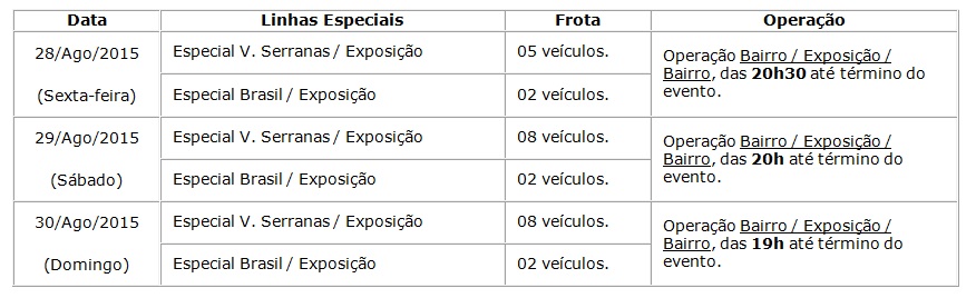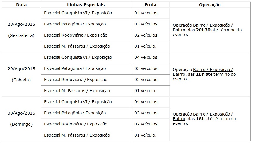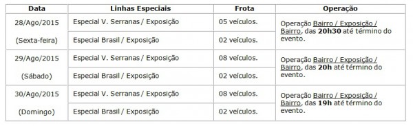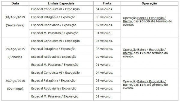 Durante a festa, as linhas regulares que fazem itinerário pela Avenida Olívia Flores deverão percorrer caminho para atendimento ao Parque de Exposições pela Avenida Brasil. Além das quatro linhas regulares que já passam pelo Parque de Exposições, serão disponibilizadas seis linhas extras, com 21 veículos. Esses ônibus realizarão viagens de ida e volta dos diversos bairros da cidade e até o Parque de Exposições.