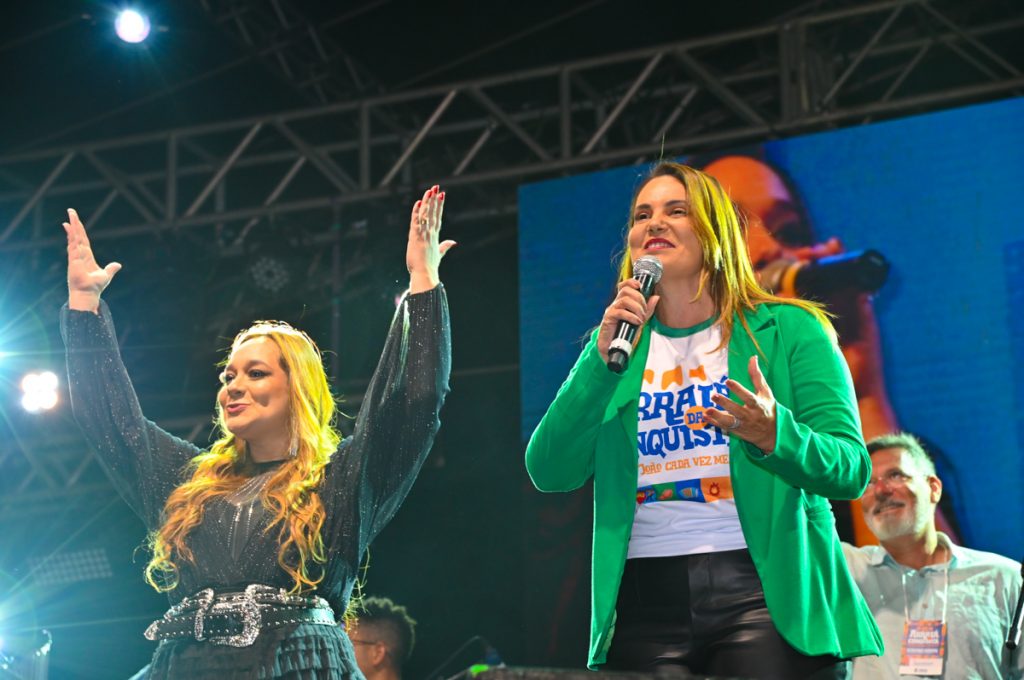 Abrindo a programação musical da primeira noite do Arraiá da Conquista, nesta terça-feira (18), a cantora Liv Moraes puxou a fila de uma grade formada somente por mulheres. Além de Liv, subiram ao palco principal as cantoras Elba Ramalho e Robertinha, além da banda Raneychas. E, no palco 2, as atrações foram Ane Brito, Keyla Batista e a banda Forró Flor de Tangerina.