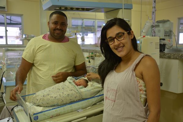 Taciana e o seu marido, Hennoc da Purificação, junto ao pequeno Heitor na Unidade de Terapia Semi-Intensiva