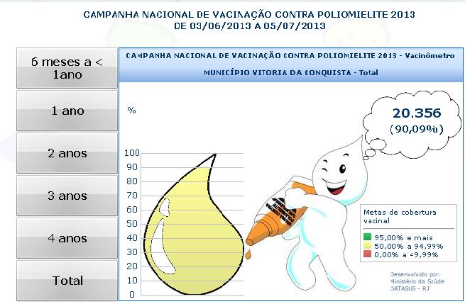 Segundo dados do Programa Nacional de Imunização (PNI) do Ministério da Saúde, até o dia 5 de julho, a Secretaria Municipal de Saúde de Vitória da Conquista vacinou 20.356 crianças maiores de 6 meses a menores de 5 anos, o que representa 90,09% do público alvo.