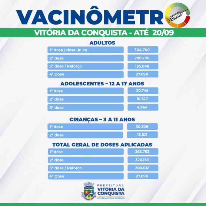 De acordo com a atualização do vacinômetro, feita pela Coordenação de Imunização da Secretaria Municipal de Saúde (SMS), de janeiro de 2021 até esta terça-feira (20), já foram imunizadas com a 1ª dose contra a Covid-19 em Vitória da Conquista, 365.753 pessoas a partir dos três anos de vida. Dessas, 320.138 receberam as duas doses, 200.012 já tomaram o primeiro reforço (3ª dose) e 27.090 o segundo reforço (4ª dose).