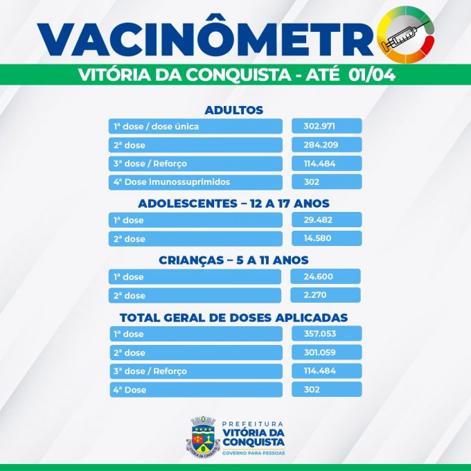 Do total de pessoas que receberam a primeira dose ou dose única, 302.971 são adultos, 29.482 adolescentes e 24.600 são crianças de 5 a 11 anos. Com a 2ª dose, foi vacinado um público de 284.209 adultos, 14.580 adolescentes e 2.270 crianças de 6 a 11 anos.