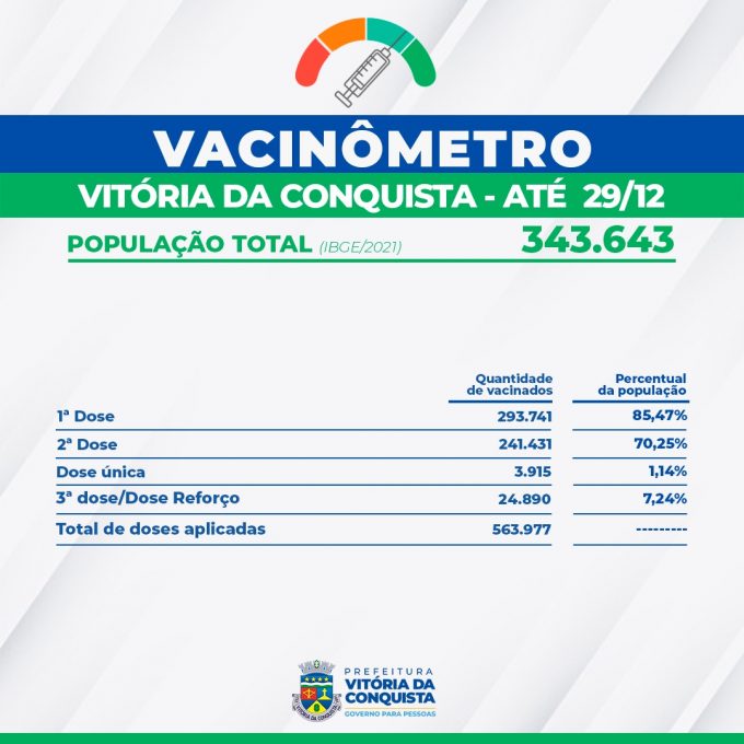O vacinômetro, atualizado pela coordenação de Imunização da Secretaria Municipal de Saúde (SMS), mostra que, até ontem (29), 293.741 conquistenses receberam a 1ª dose, equivalente a uma cobertura vacinal de 85,47% da população total, de acordo com a estimativa do IBGE/2021.
