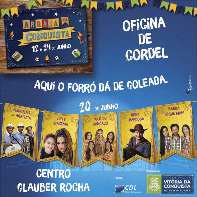 Nesta quarta (20), a programação do Arraiá da Conquista chega ao ponto principal da festa, com 23 atrações da região. Até a sexta-feira (22), serão quase 40 horas do mais autêntico forró no Centro Glauber Rocha. Os portões serão abertos às 18 horas e os shows terão início às 19 horas.