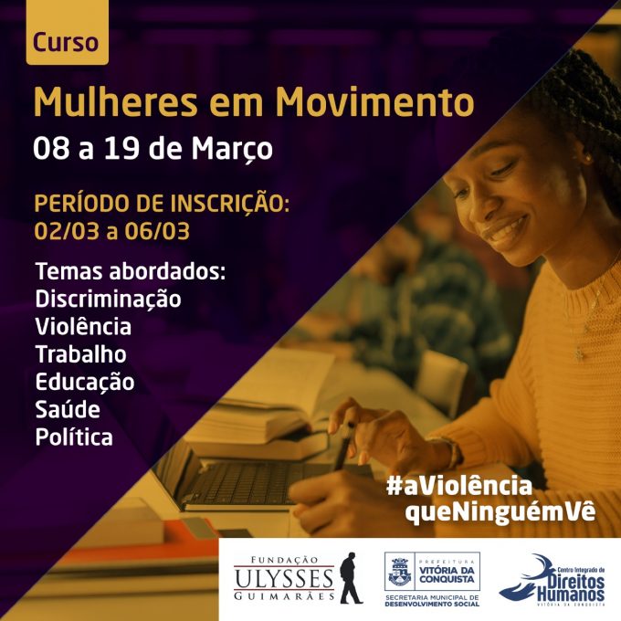 Estão abertas, de 02 a 06 de março, as inscrições para o curso online “Mulheres em Movimento” realizado pela Prefeitura Municipal de Vitória da Conquista, por meio do Centro Integrado de Direitos Humanos, em parceria com a Fundação Ulysses Guimarães.