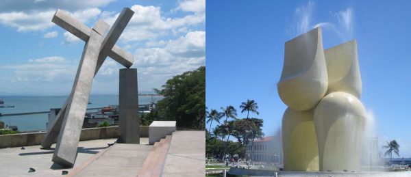 Duas obras famosas de Mário Cravo, instaladas em Salvador: a Cruz Caída e a Fonte da Rampa do Mercado