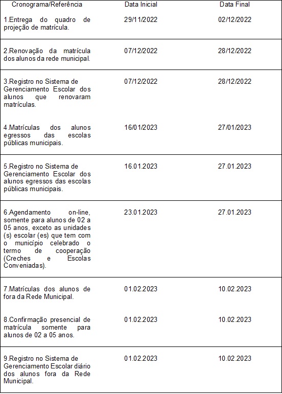 O período de matrículas na escolas municipais para o ano letivo de 2023 começará no dia 7 de dezembro, inicialmente com a renovação da matricula dos estudantes que permanecerão na escola onde já estudam. Em janeiro, abre o período para estudantes que mudarão de uma escola para outra, dentro da rede pública municipal, e em fevereiro para estudantes de fora da rede, conforme cronograma ao lado.