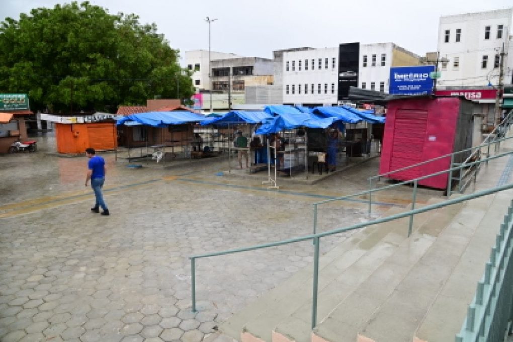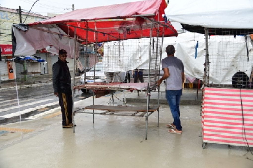 A chuva da tarde deste sábado não atrapalhou a realocação das 62 barracas da Praça da Bandeira que estavam situadas em frente às lojas, no entorno do espaço, enquanto a Prefeitura executava a requalificação da praça. A mudança começou às 14h, e contou com o apoio da Secretaria Municipal de Serviços Públicos (Sesep).