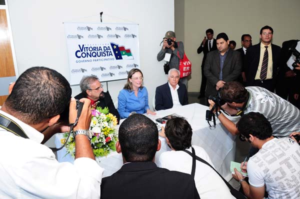 A Ministra da Secretaria Nacional de Direitos Humanos, Maria do Rosário, conhece bem o trabalho desenvolvido pela Prefeitura de Vitória da Conquista. A familiaridade com o Governo Municipal lhe permitiu comentar, com conhecimento de causa, algumas das ações realizadas na cidade que ela visitou nesta quinta-feira, 18. Naturalmente, a ministra deu maior ênfase à atenção dada pelo Município aos direitos humanos. “É uma alegria estar aqui, porque Vitória da Conquista é uma cidade que tem políticas públicas de direitos humanos, sociais e econômicos que são conhecidas por todos nós no Brasil”, disse, durante a entrevista coletiva concedida à imprensa local, na sede do Ministério da Agricultura.