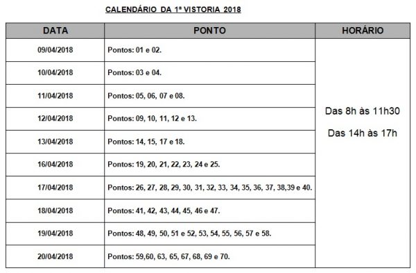 Os permissionários do serviço de táxi em Vitória da Conquista devem ficar atentos ao prazo da primeira vistoria técnica para o ano de 2018. A ação, realizada pela Secretaria Municipal de Mobilidade Urbana (Semob), será executada de 9 a 20 de abril, no Deserg, localizado na Rua Santa Catarina, s/n, bairro Patagônia.
