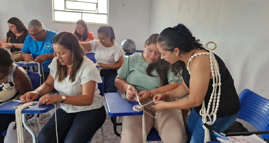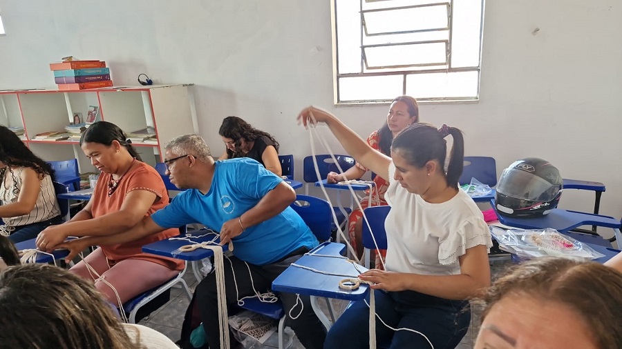 A Secretaria Municipal de Educação (Smed) está oferecendo o curso de macramê para 23 monitores e auxiliares de vida escolar das Escolas Nucleadas. O objetivo é promover a formação artística de agentes multiplicadores de cultura artesanal e a geração de renda local nas comunidades do campo e quilombolas. O projeto foi selecionado pelo Edital da Lei Paulo Gustavo/Ministério da Cultura e Secretaria Municipal de Cultura, Turismo, Esporte e Lazer (Sectel), com realização da facilitadora e proponente, Kely Lopes, que na última semana iniciou o curso na sede das Escolas Nucleadas, onde reuniu 23 monitores e cuidadores de vida escolar.