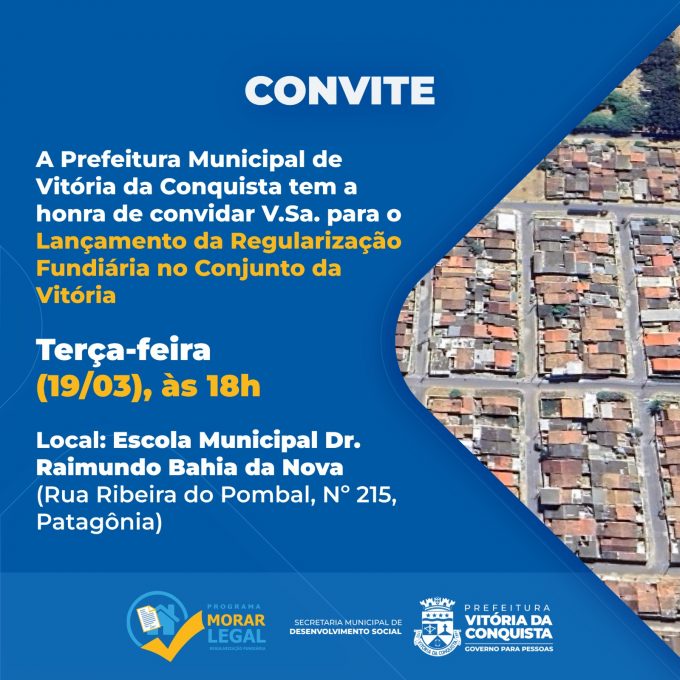 A Prefeitura de Vitória da Conquista realiza nesta terça-feira (19), às 18h, a solenidade de início do processo de regularização fundiária do loteamento Conjunto da Vitória. O evento acontece na Escola Municipal Dr. Raimundo Bahia da Nova, localizada na Rua Ribeira do Pombal, bairro Patagônia.