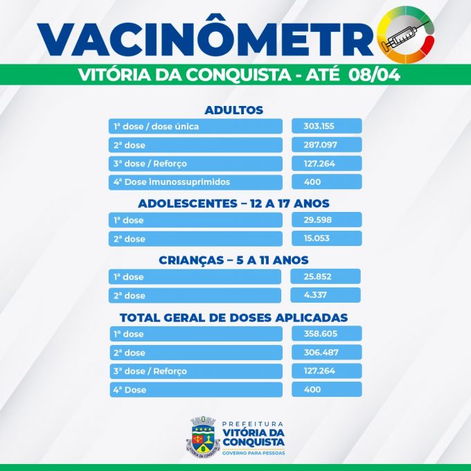 A Secretaria Municipal de Saúde (SMS) atualizou, nessa sexta-feira (8), o vacinômetro que contabiliza 358.605 pessoas que se vacinaram em Vitória da Conquista com 1ª dose ou dose única, 306.487 com as duas doses e 127.264 com a 3ª dose. Ao todo, foram utilizadas 792.756 doses de vacina contra a Covid-19 para imunizar a população.