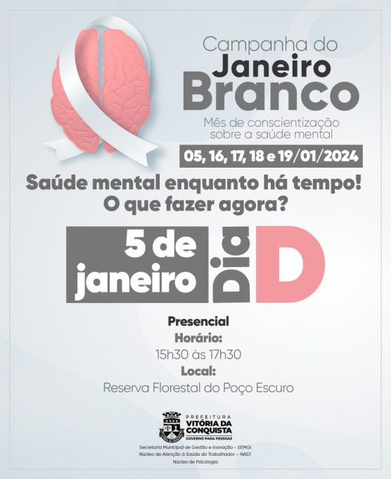 A Secretaria Municipal de Gestão e Inovação, por meio do Núcleo de Atenção à Saúde e de Segurança no Trabalho (NAST), promove nesta sexta-feira (5), às 15h30, o lançamento da campanha Janeiro Branco, com uma atividade de interação com a equipe do serviço na Reserva do Poço Escuro.