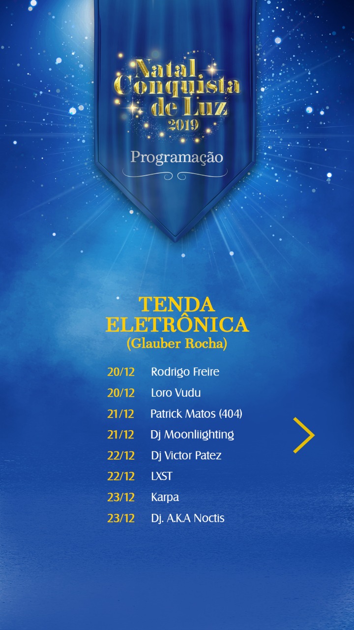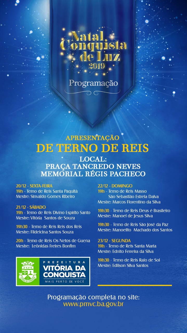 O Natal é uma das festas mais esperadas. E neste ano, o Natal Conquista de Luz, evento promovido pela Prefeitura Municipal, mescla o tradicional ao inovador. Shows e concertos musicais, apresentações de ternos de reis e corais e tenda de música eletrônica fazem parte da programação.