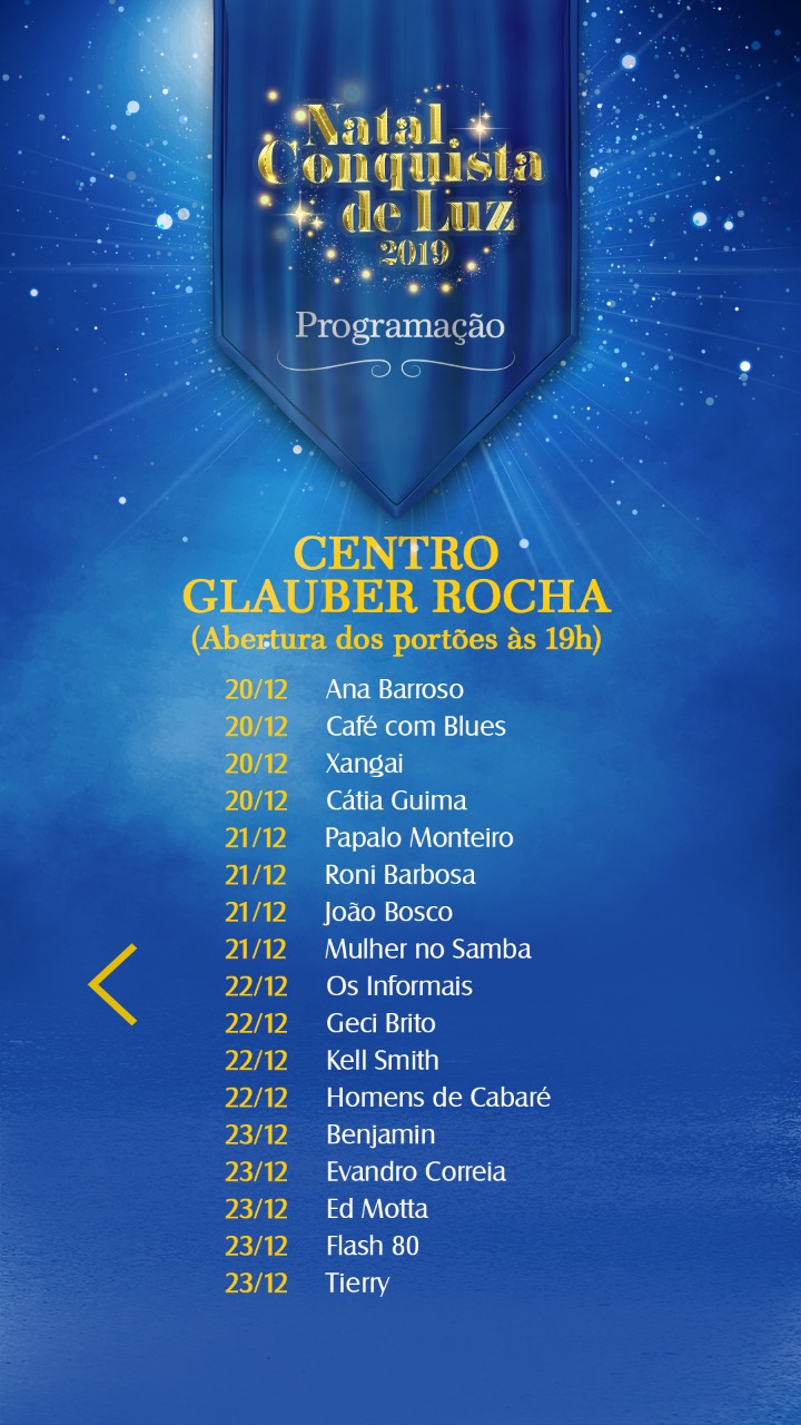 Os grandes shows, como de costume, serão realizados no Centro Cultural Glauber Rocha de 20 a 23 de dezembro. Nomes como Ed Motta, João Bosco, Kell Smith, Xangai e Tierry se apresentam na festa, dividindo o palco com músicos regionais.