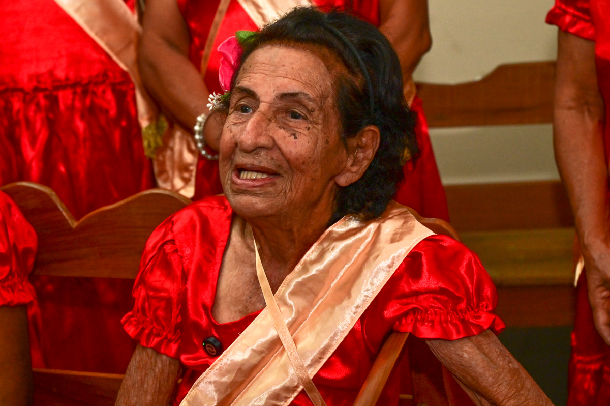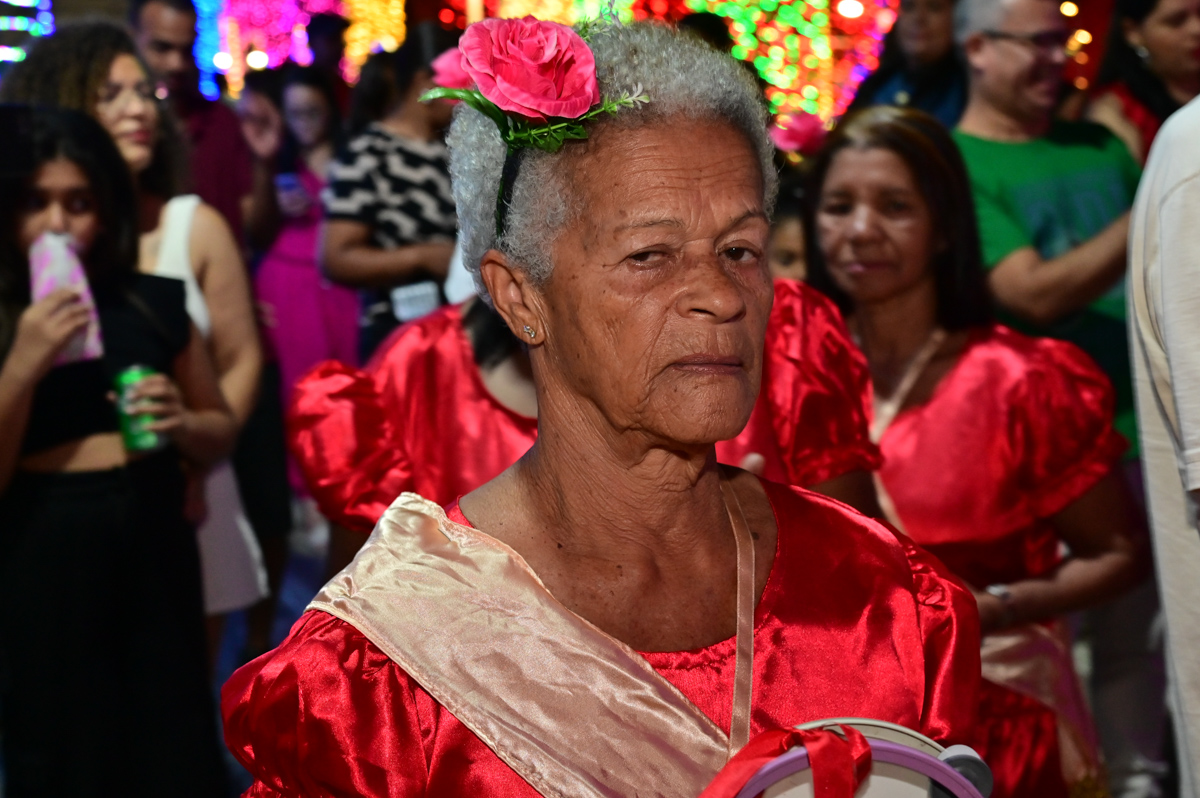 No cenário das luzes da Praça Tancredo Neves, o destaque foi o Terno das Rosas, vindo do distrito de José Gonçalves. Liderado pela mestre Dolores dos Anjos, de 90 anos, o grupo é uma raridade por ser formado integralmente por mulheres. O nome é uma homenagem à Nossa Senhora: “O terço são as rosas dela”, explicou Dona Dolores.