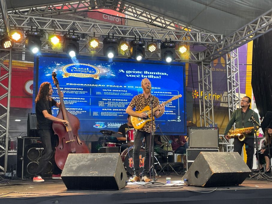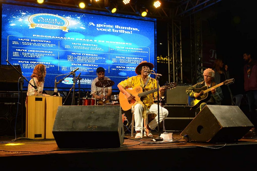 Mesmo com o clima chuvoso, a Praça 9 de Novembro recebeu na noite dessa quarta-feira (21) as apresentações dos artistas do Natal Conquista de Luz. Dois artistas se apresentaram pela primeira vez no evento.