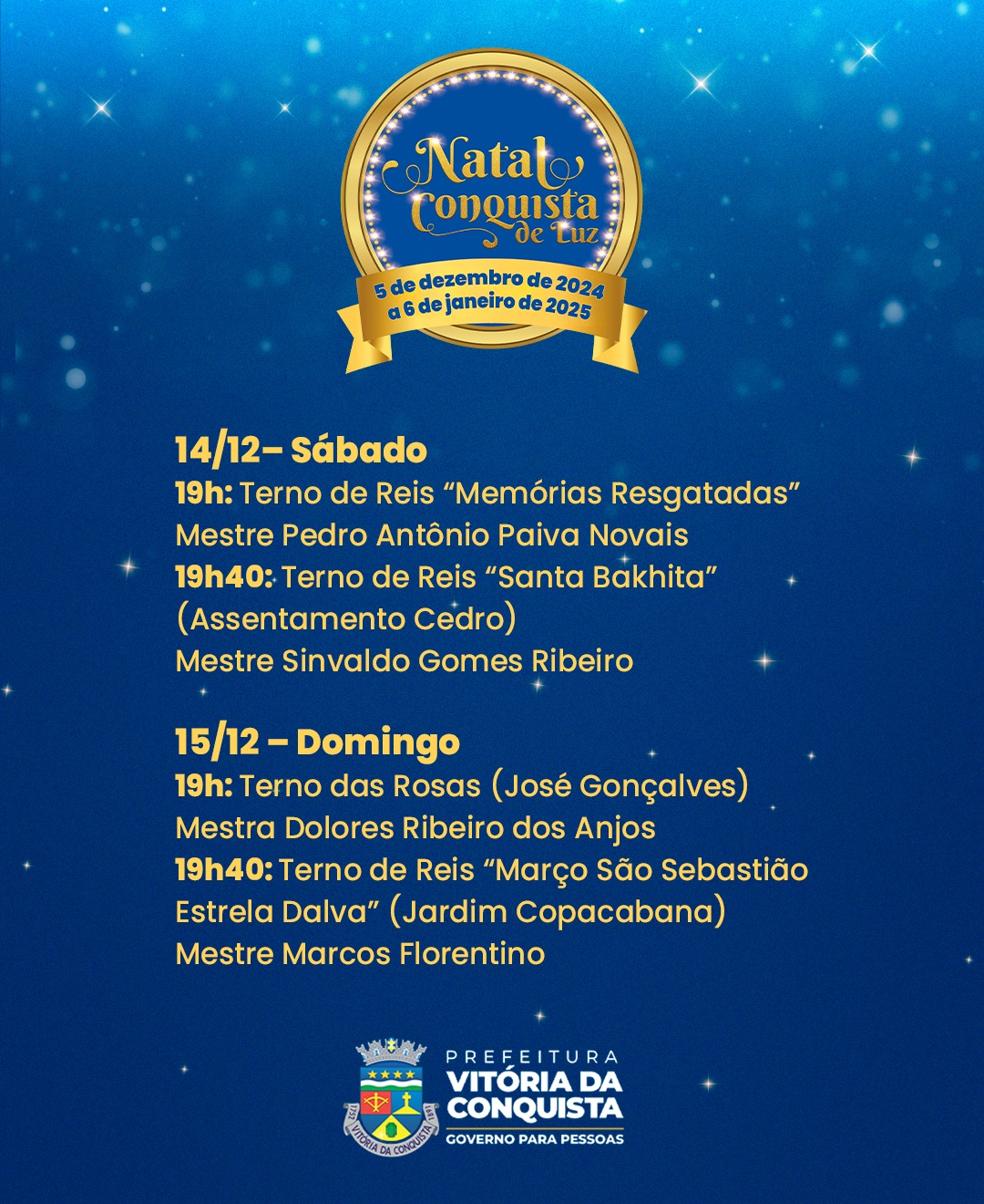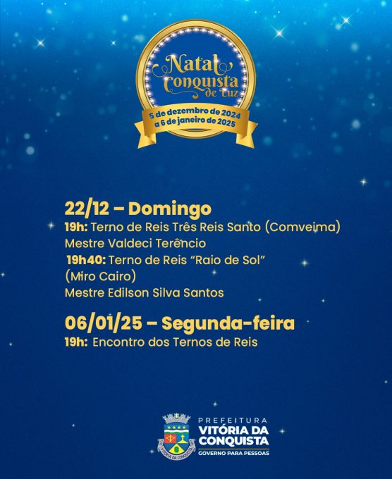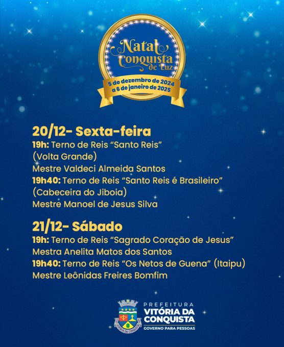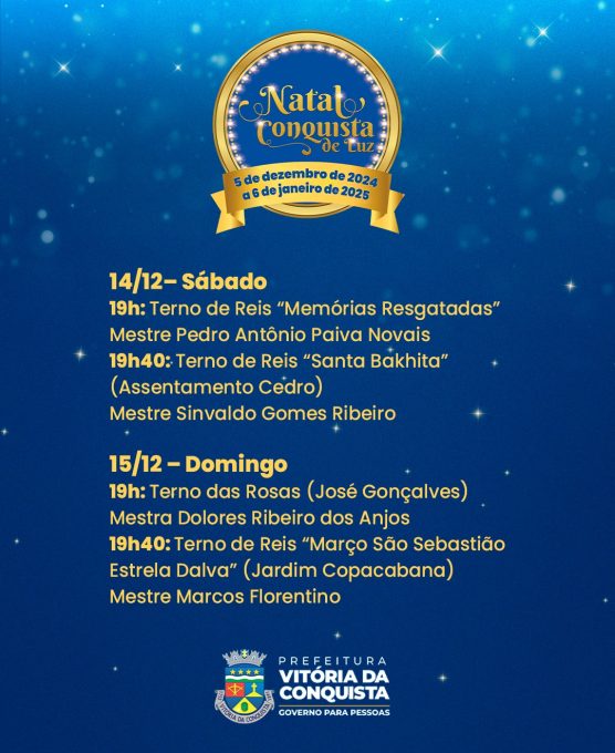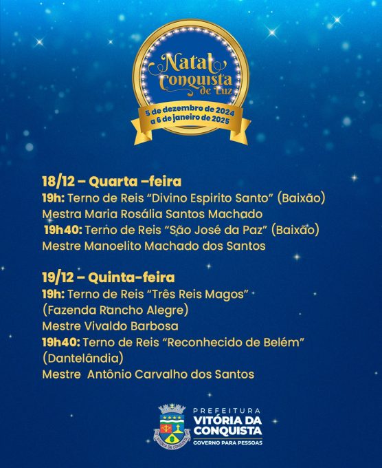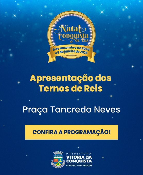 A Prefeitura de Vitória da Conquista deu início, oficialmente, à programação natalina na cidade, com o acendimento das luzes na Praça Tancredo Neves, na noite do dia 5. A praça, que ganhou colorido e decoração especiais para este período, também será palco para apresentações de Ternos de Reis, a partir do dia 14 de dezembro.