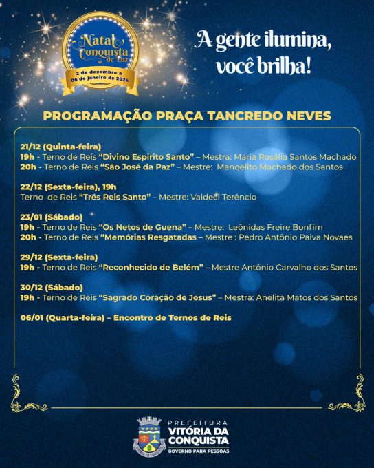 Na praça Tancredo Neves, seguem as apresentações dos ternos de reis de diferentes bairros e povoados do município. Na sexta-feira (15), a partir das 19h, o louvor ao nascimento de Jesus fica por conta do Terno das Rosas, do distrito de José Gonçalves. No sábado (16), se apresenta o terno de reis Três Reis Magos, do Iguá, e no domingo (17) é a vez do Raio de Sol animar a praça. Na Tancredo Neves, a programação irá até o dia 30 de dezembro e retornará no dia 6 de janeiro, Dia de Reis, com o Encontro de Terno de Reis.
