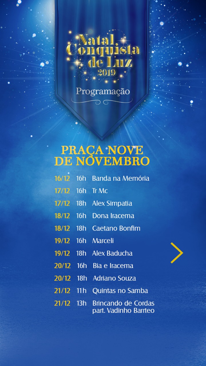 Dezembro chegou e, junto a ele, o Natal Conquista de Luz. Shows e concertos musicais, apresentações de ternos de reis e corais e tenda de música eletrônica fazem parte da programação.