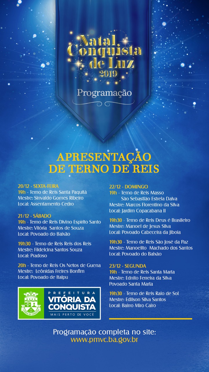 Para o secretário de cultura, Adriano Gama, 2019 terá um Natal Conquista de Luz especial. Ele explica que o objetivo é agradar a todo público. “Além das atrações musicais, tivemos a preocupação em resgatar tradições culturais como os ternos de reis. Estamos tendo a oportunidade de honrar essa arte antiga e mantê-la viva. Está tudo sendo feito com muito empenho e dedicação porque Conquista merece!”, comenta o secretário.