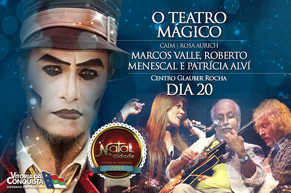Oferecendo à população o que há de melhor na música regional e brasileira, o Natal da Cidade recebe nesse sábado, 20, a banda O Teatro Mágico, que se apresenta pela terceira vez na programação. Ainda na mesma noite, o palco montado no Centro Glauber Rocha – Educação e Cultura recebe o show do trio bossa nova Marcos Valle, Patrícia Alvim e Roberto Menescal.