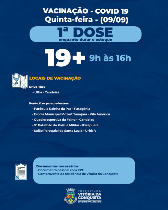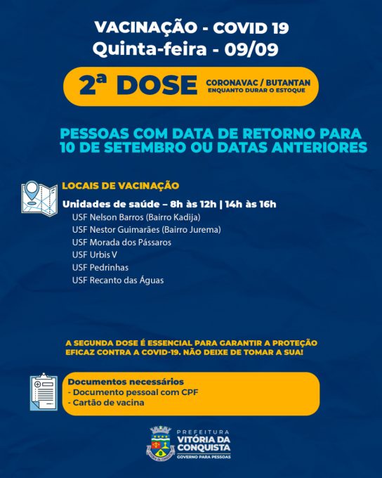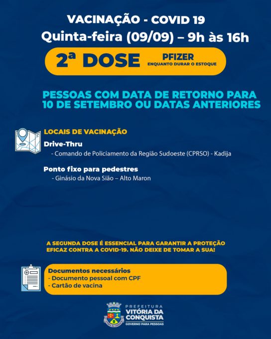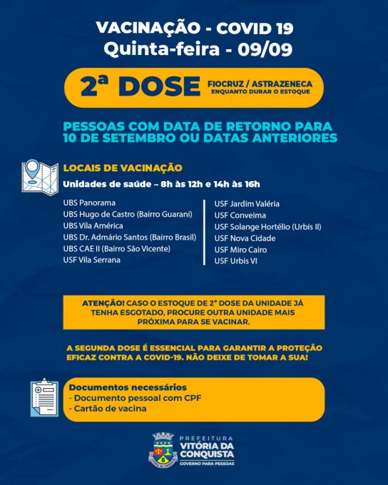 SEGUNDA DOSE – Continua também nesta quinta (9), a aplicação da 2ª dose para quem tem data agendada para o dia 10 de setembro ou datas anteriores. Os pontos de vacinação estão divididos por tipo de fabricante, a fim de evitar mistura de imunizantes e erros de imunização.